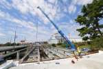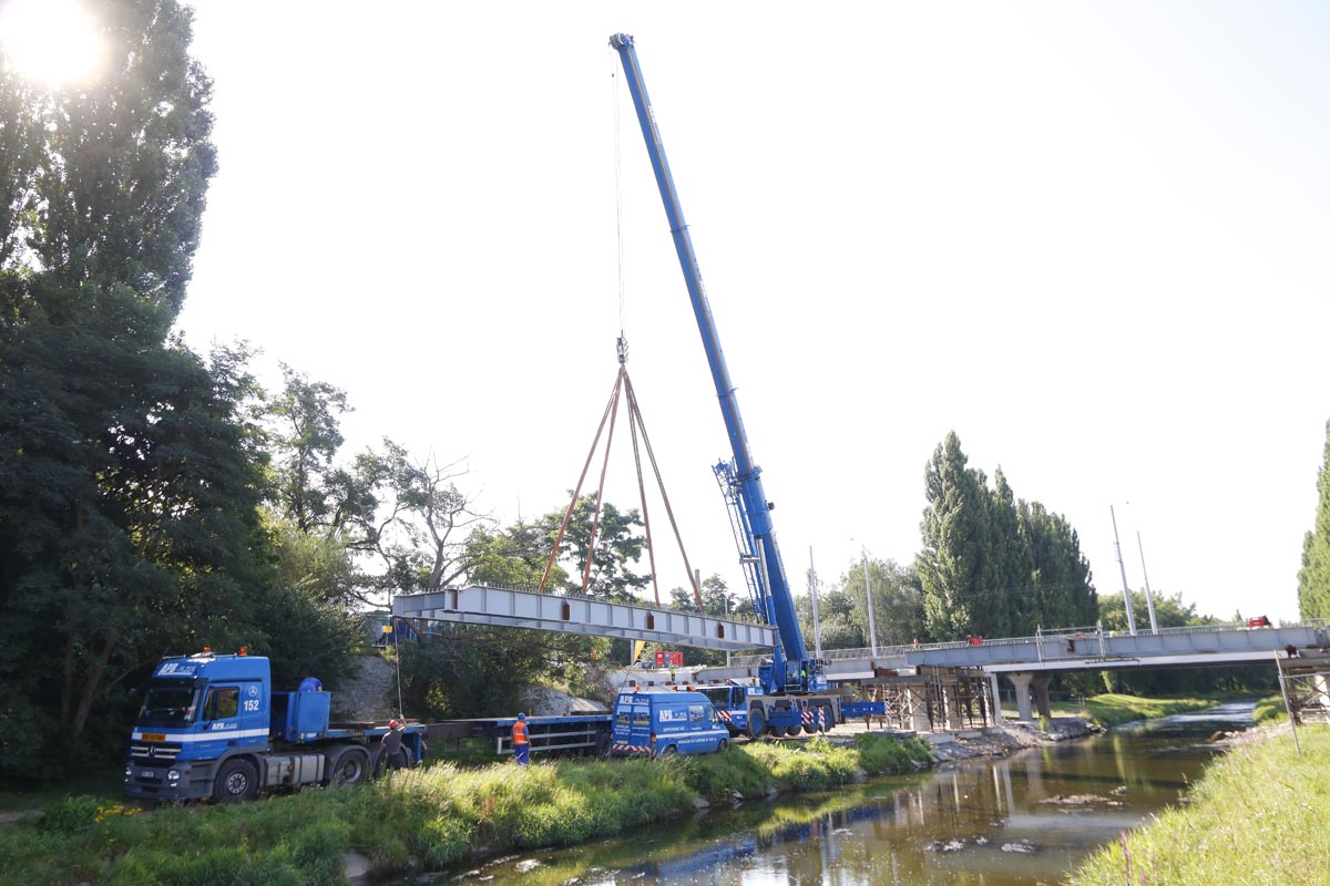 Transport and placement of bridge structure by crane AC 200 and crane AC 350. This is a reconstruction of bridge at Rokycanská street Plzeň.