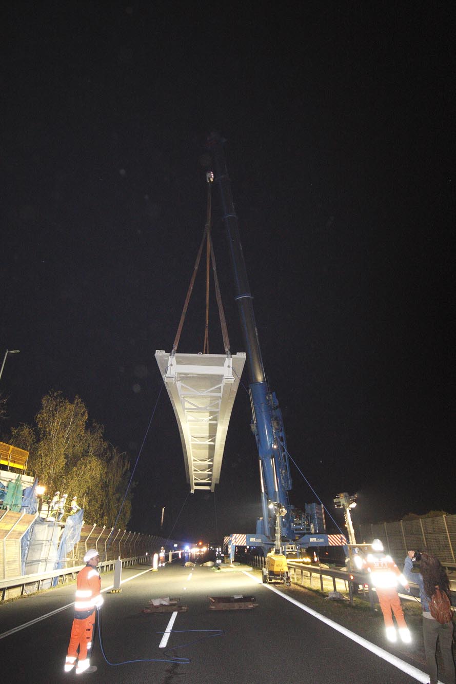 Transport and installation of an arched footbridge over the D5 motorway at Králova Dvůr, length 33.00 meters, weight 72 tons